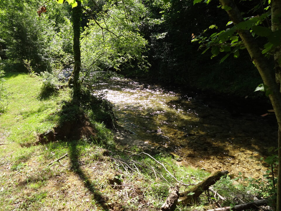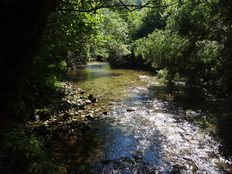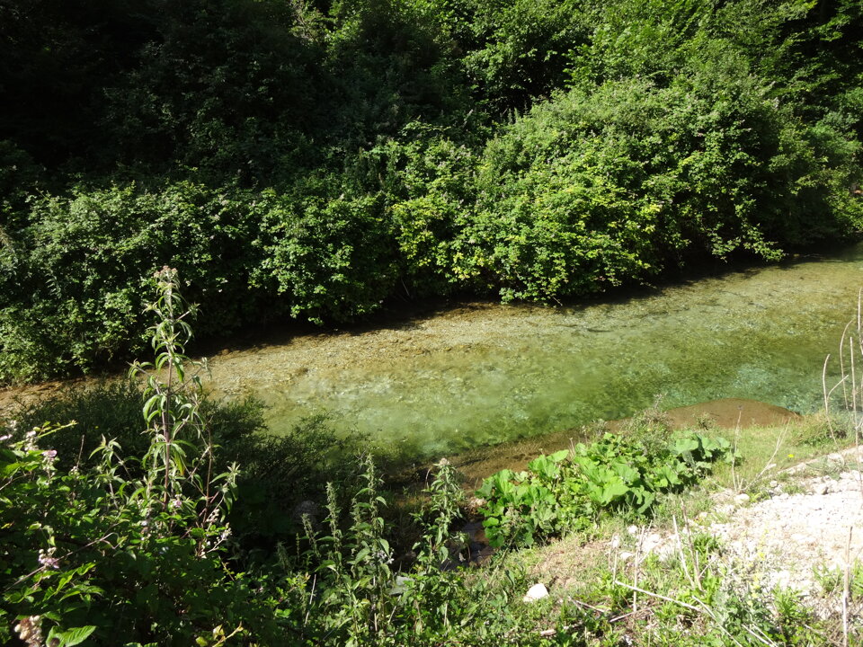 A valle di Trevi il fiume scorre in una valle molto incassata ricevendo solo piccoli tributi idrici fra i quali si annovera quello della Sorgente dell'Inferniglio che gli tributa da destra presso Jenne con portate variabili da 0,1 a 1,6 m³/s . Dopo avere bagnato Subiaco la valle s'allarga e giunto ad Agosta il fiume riceve parte del tributo delle copiose e famosissime Sorgenti dell'Acqua Claudia e dell'Acqua Marcia nel territorio di Arsoli e Marano Equo, fin dall'epoca romana captate per la maggior parte dall'acquedotto a servizio di Roma (vedere dopo) che vi prende il nome.